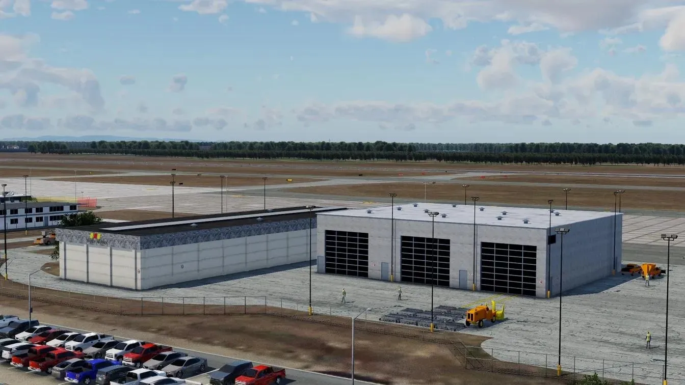 Every major structure is custom modelled, including the terminal, control tower, hangars, and even the elevated observation platform next to the P4 parking area. A wide array of static assets, like parked cars, aircraft, and various ground equipment, is also implemented. Ground textures have been hand-crafted to avoid visible tiling, and 3D crowd models provide a sense of life and activity.