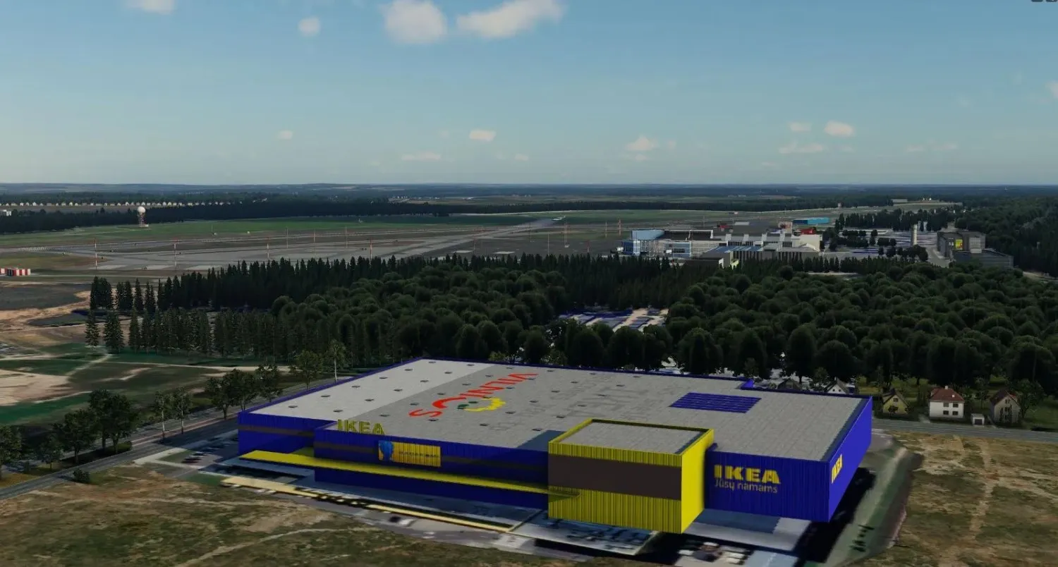 Beyond the airfield, Emilis has included surrounding landmarks, like the local IKEA warehouse, cargo handling facilities, general aviation hangars, and the plane spotting area near the perimeter.
