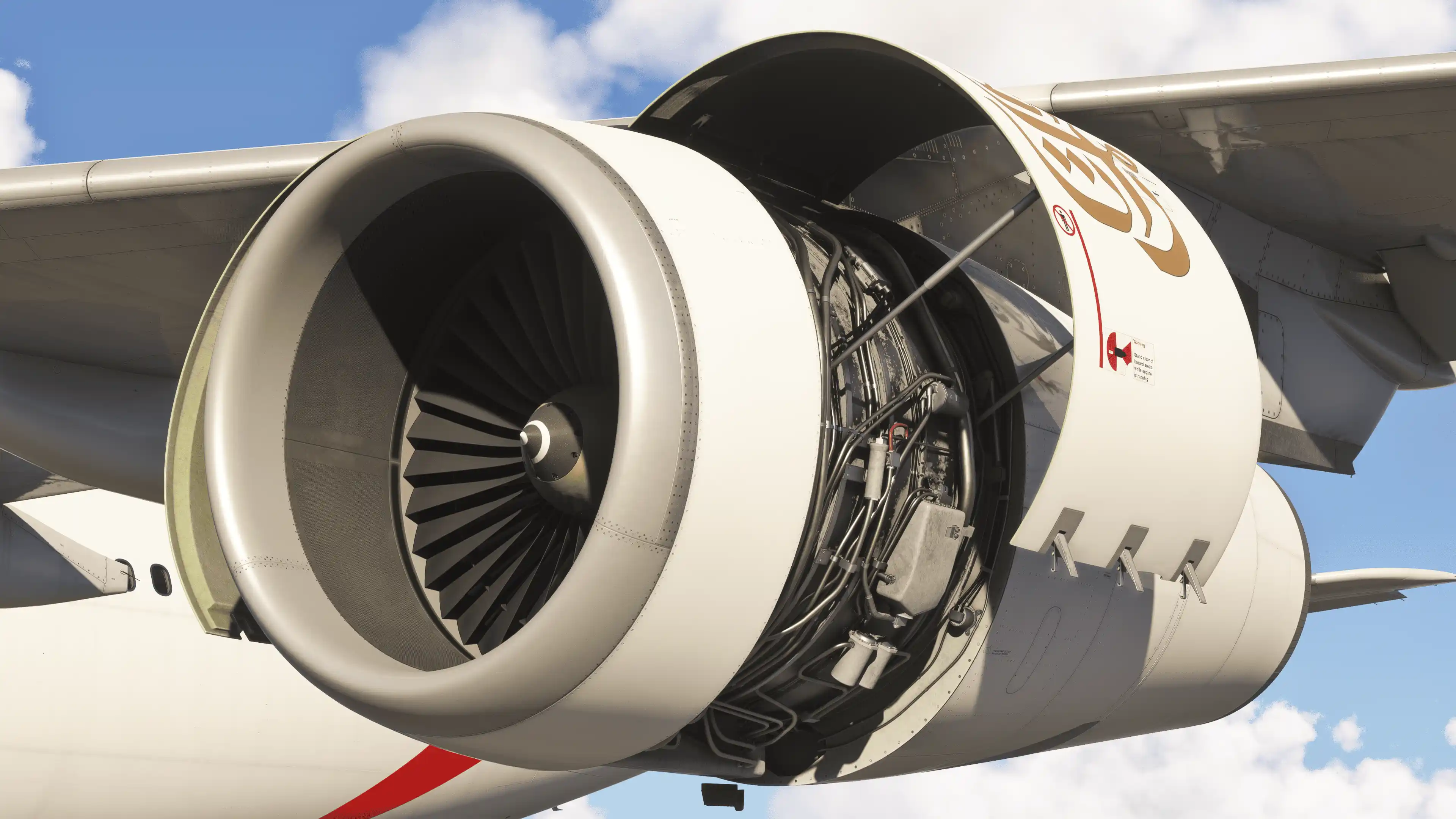 Moving on with the update, the next part covers the infamous engines - or shall I say the 4 additional APUs. One of the more interesting features of the engines is the use of the FS24 ‘shader’ effect for the engine spinners, making the transitions between different thrust settings look much smoother. The only issue with this effect however, is that the fan is turning the opposite way, due to the current simulator limitations. As with all iniBuilds products, the A340 will also feature openable engine cowlings.