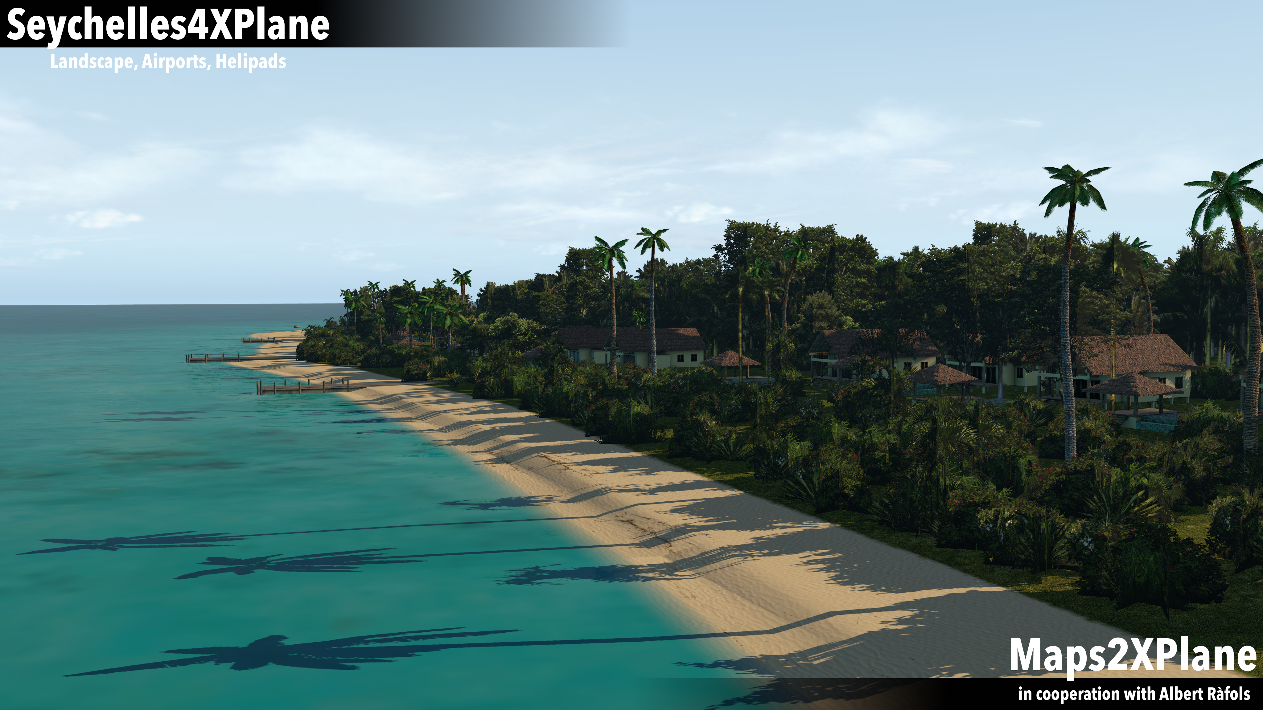 "Expect untouched nature, stunning atolls and lagoons, dense tropical vegetation, and here and there a few signs of civilization. That means for our Seychelles rendition for X-Plane: photorealistic terrain mesh paired with custom 3D vegetation, custom generic autogen, and custom dynamic traffic on land and on the sea. Last but not least: Selected islands, hosting IRL hotels and resorts, received also some extras: We populate them with custom objects and buildings, based on real counter-parts."