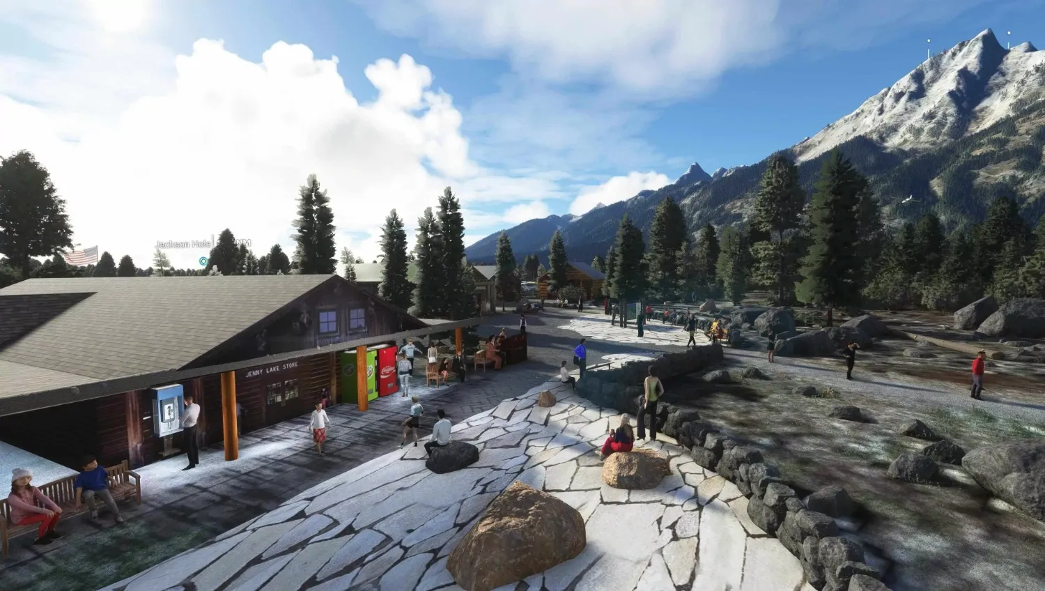 Centred on Jenny Lake, the update adds far denser detail across the visitor hub and shoreline, with bespoke models, for the visitor centre, store, trail bridges, park signage, boat docks, and the Jenny Lake Lodge entry, plus improved parking layouts, lighting, and ground clutter, for a lived-in feel.