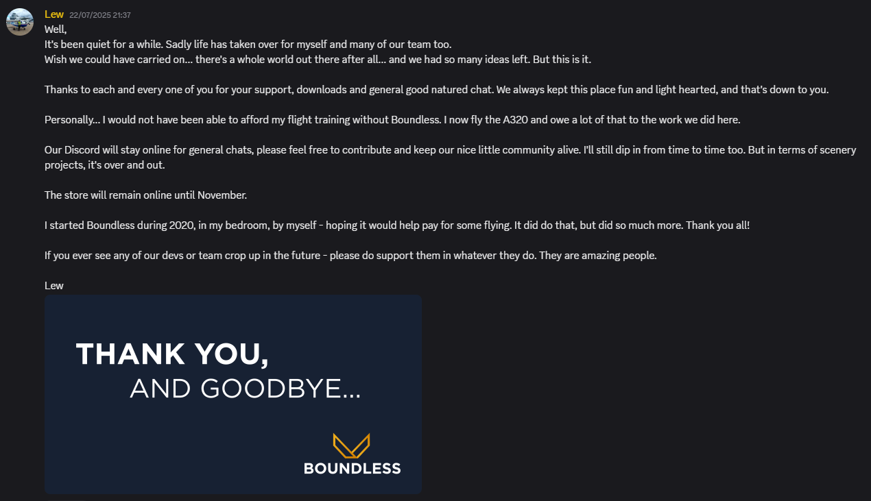 With the storefront now gone, we see quite an influential developer finally leave the scene. With a remarkable number of airfields built over the years, the legacy of Boundless will certainly be remembered for a long time.