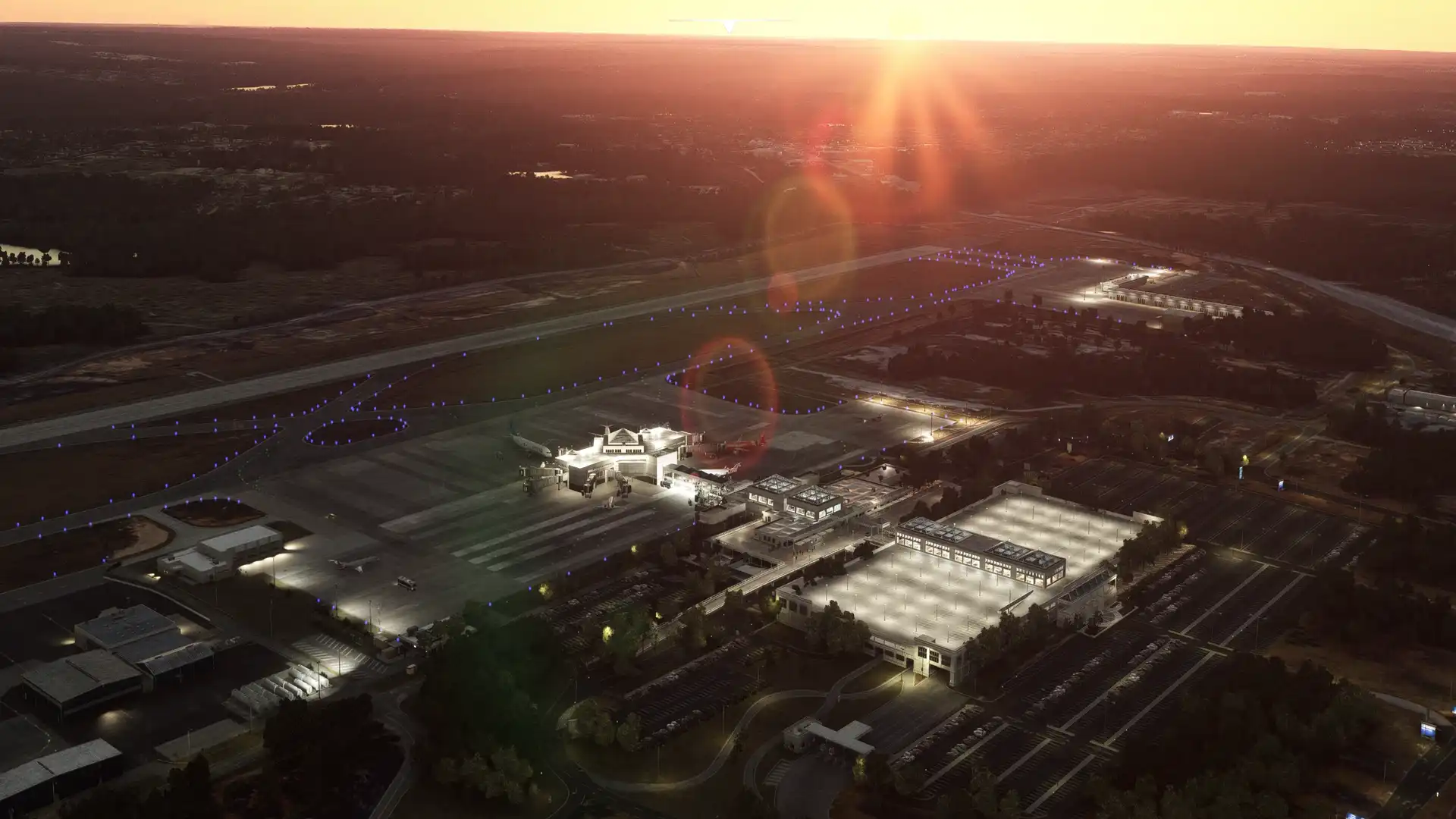 The scenery features an accurate rendition of the airport, with hand-made surfaces, highly detailed terminals, a fully modeled landside area, custom dynamic lighting, over 150 handcrafted models, and custom animated jetways.
