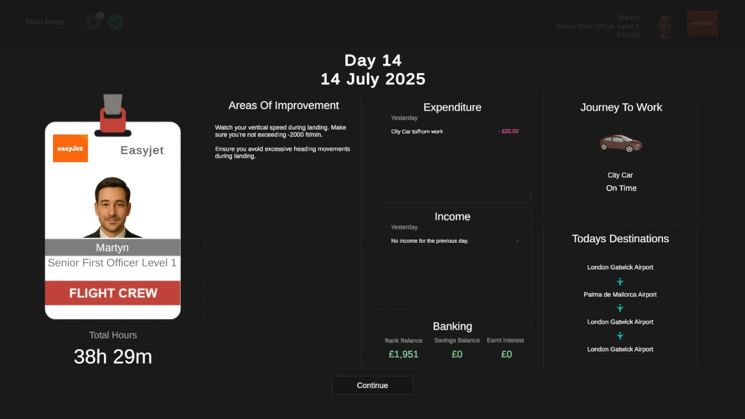 Fly the Line allows you to assume the role of a short-haul airline pilot, starting as a Junior First Officer and advancing toward the rank of Fleet Captain. Career progression is guided by performance across scheduled flights, with players earning cash, XP, and skill points to unlock new abilities, lifestyle improvements, and boost well-being, factors that influence job effectiveness.