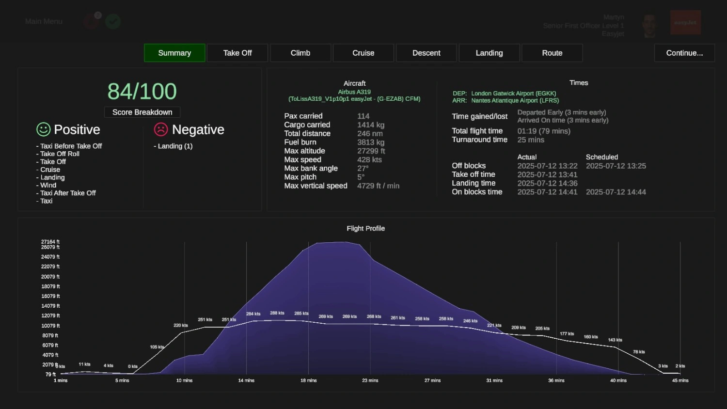 Each flight is logged in a logbook, detailing performance metrics and feedback on landing quality, as well as other parameters. You can also create a custom airline, using any aircraft.