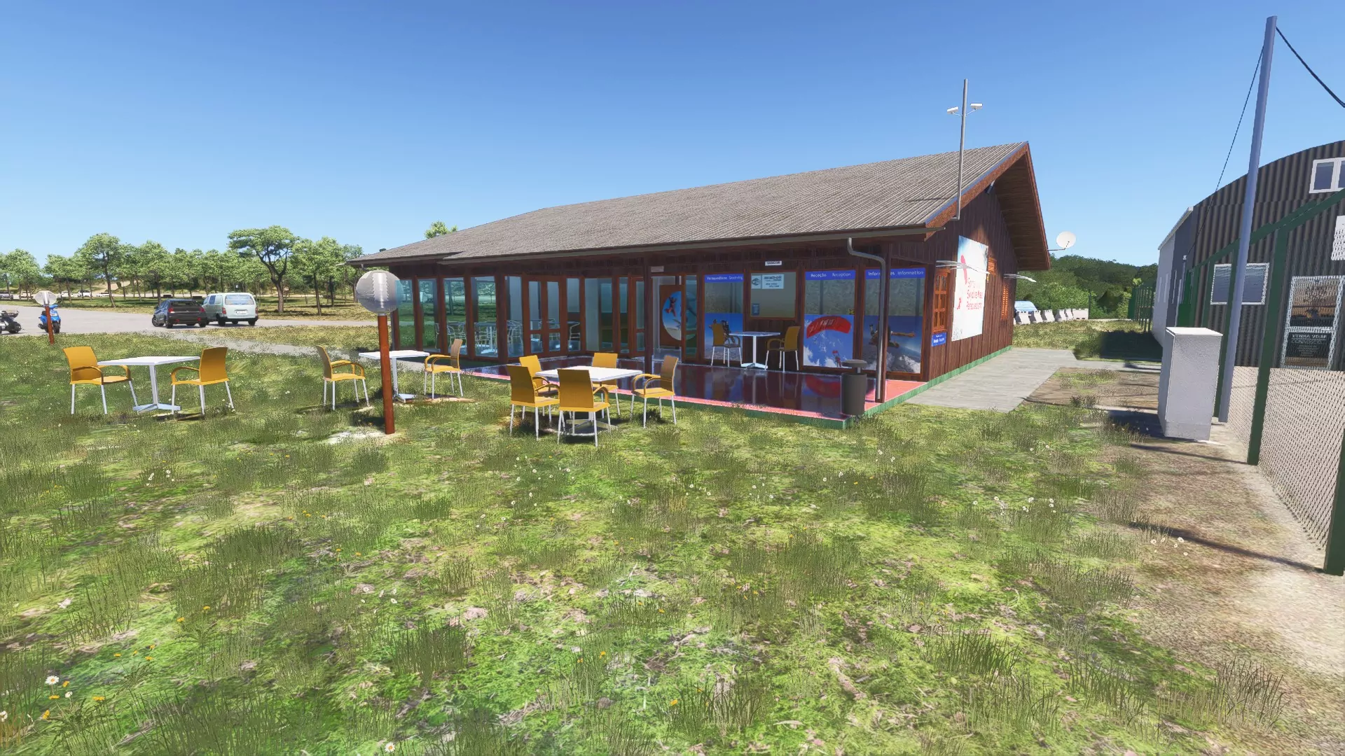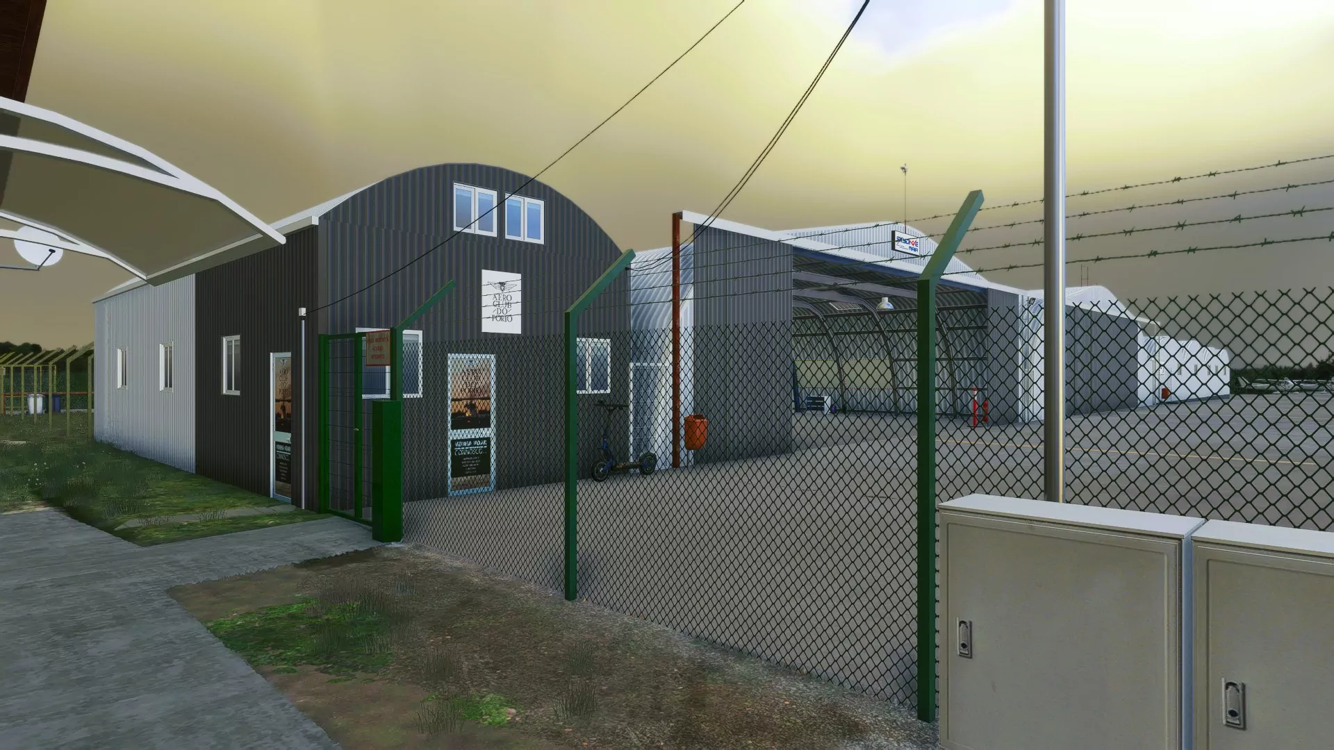 The scenery features an accurate rendition of the airport, with custom 3D buildings, an up-to-date ground layout, a realistic runway elevation profile, detailed landside, a fully modeled Skydive Hangar interior, a fully modeled Café interior, custom airport vehicles, and more.
