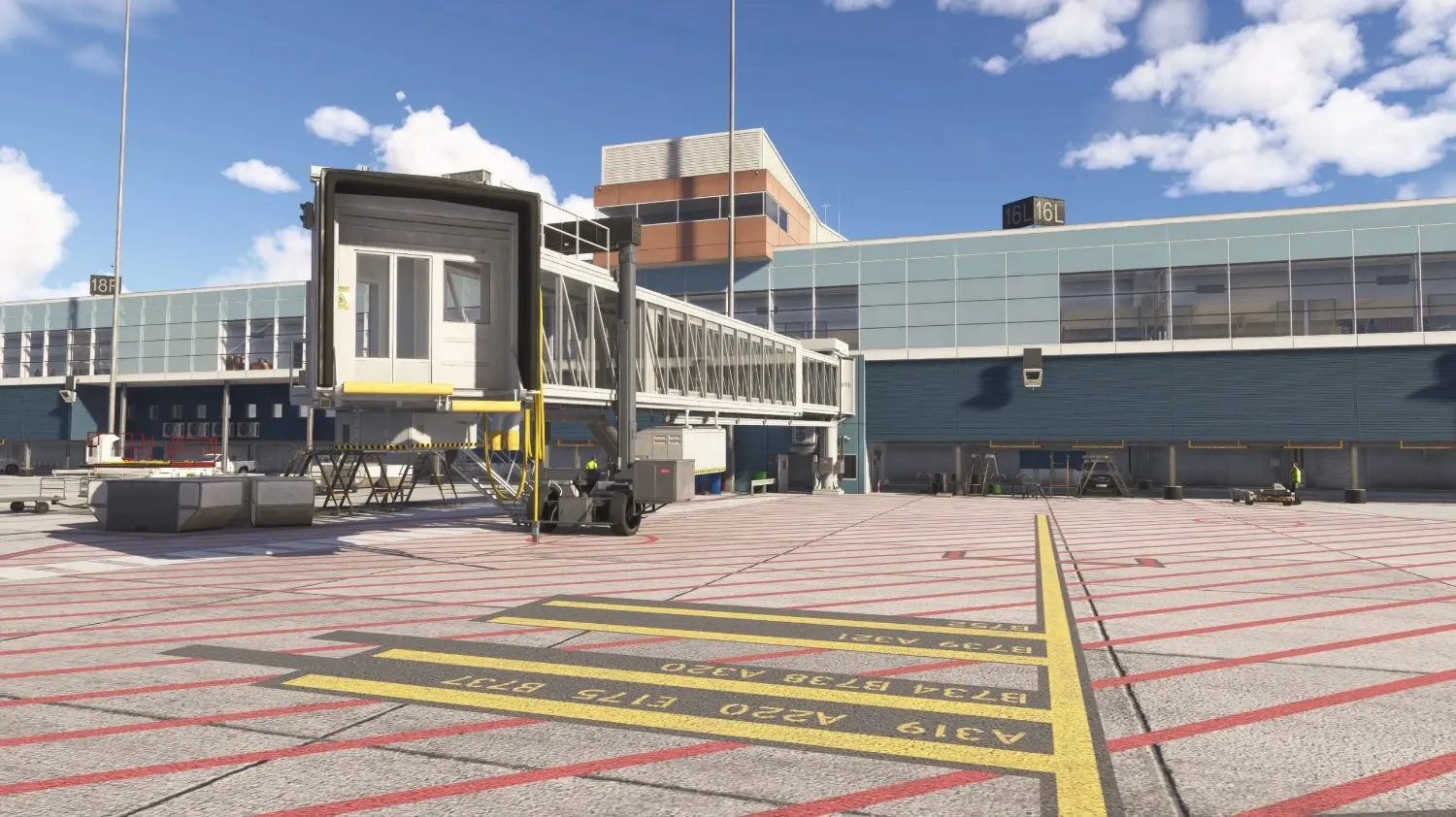 The scenery package features a highly detailed rendition of the airport, including a fully modelled terminal interior, updated taxiways, custom terrain elevation and airport lighting, and animated ground vehicles. Enhancements for Microsoft Flight Simulator 2024 include newwalkable jetways. The scenery is also compatible with AI traffic, and includes custom aerial photogrammetry and infrastructure, based on extensive reference material. The new Safedock FleX docking system is also depicted, as well as animated traffic.