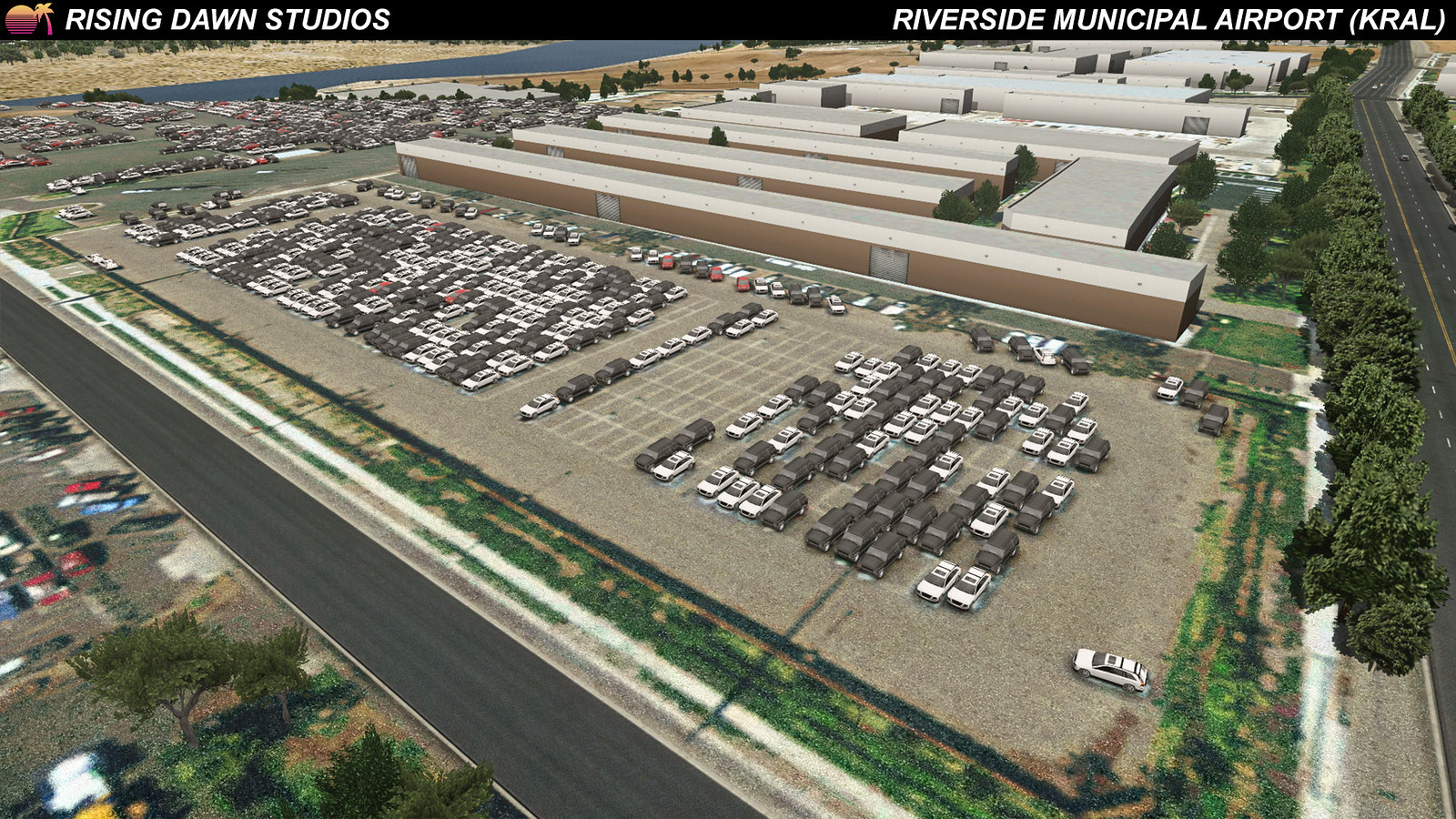 Rising Dawn Studios has continued to develop Riverside Municipal Airport (KRAL) for X-Plane. In the latest previews, emphasis on the environment around the airport and details such as air-conditioning units, car parking lots and ground texturing: