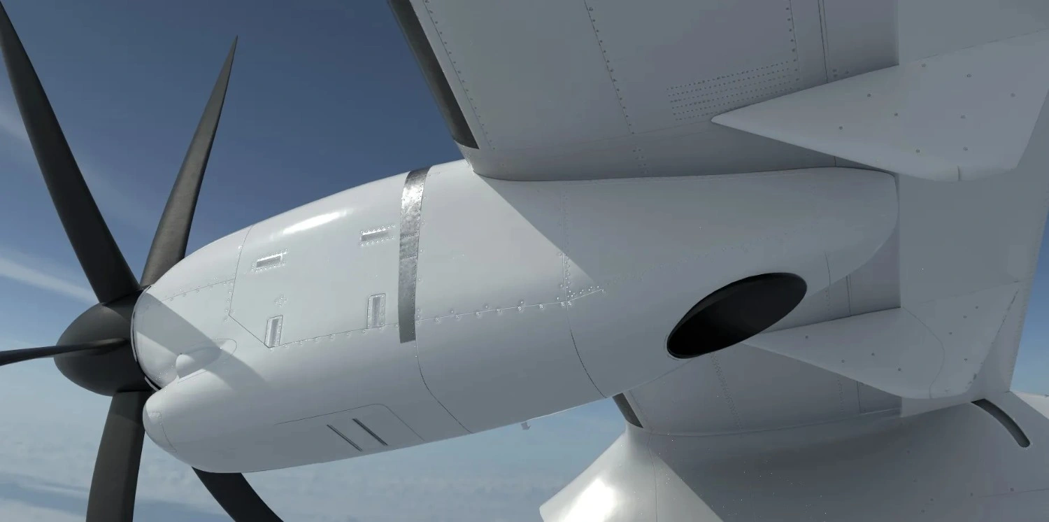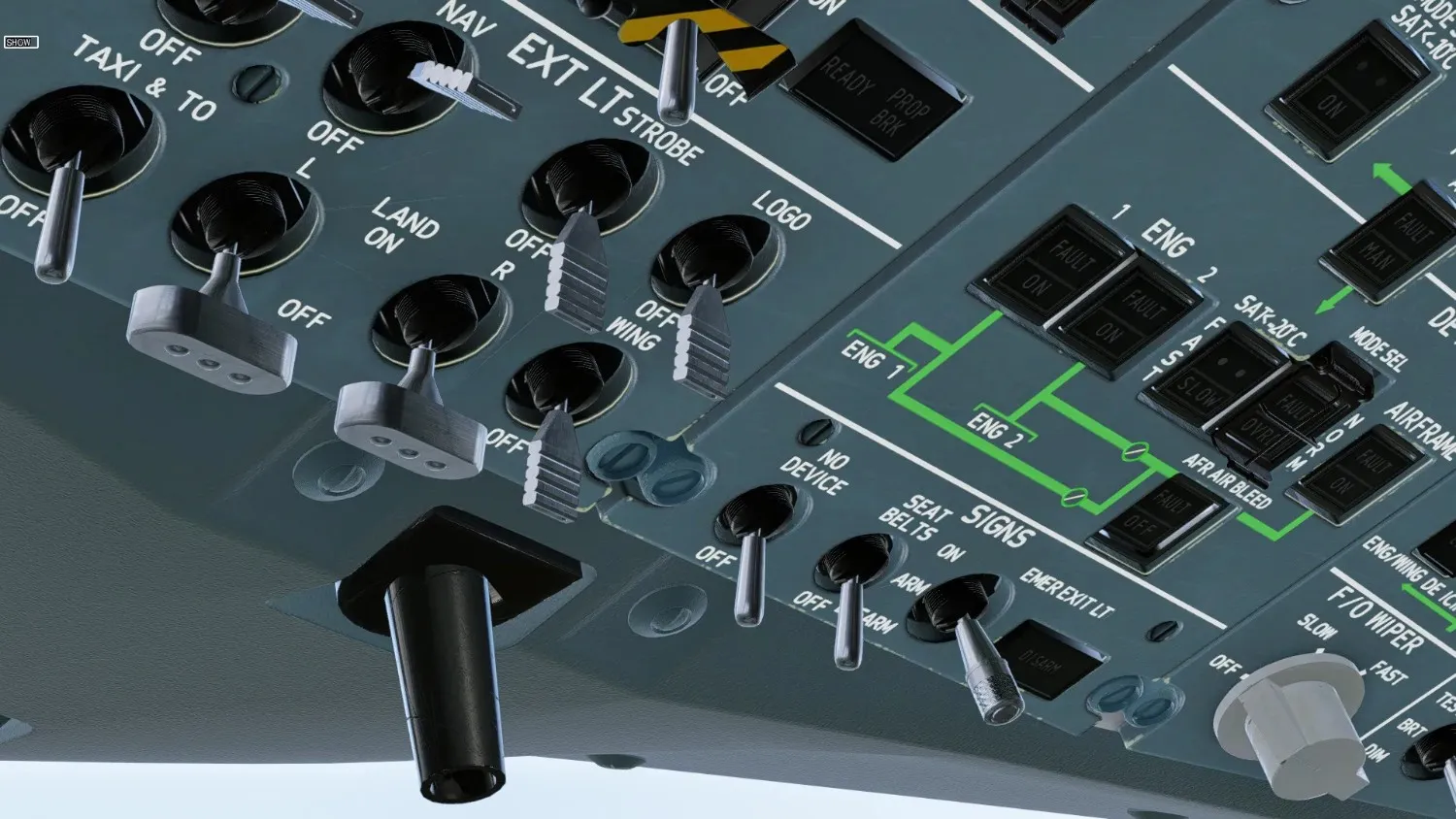 The images highlight flight deck modelling, FCP and displays, the overhead and circuit breaker panels, oxygen masks, night lighting, and turboprop, wing, and exterior.