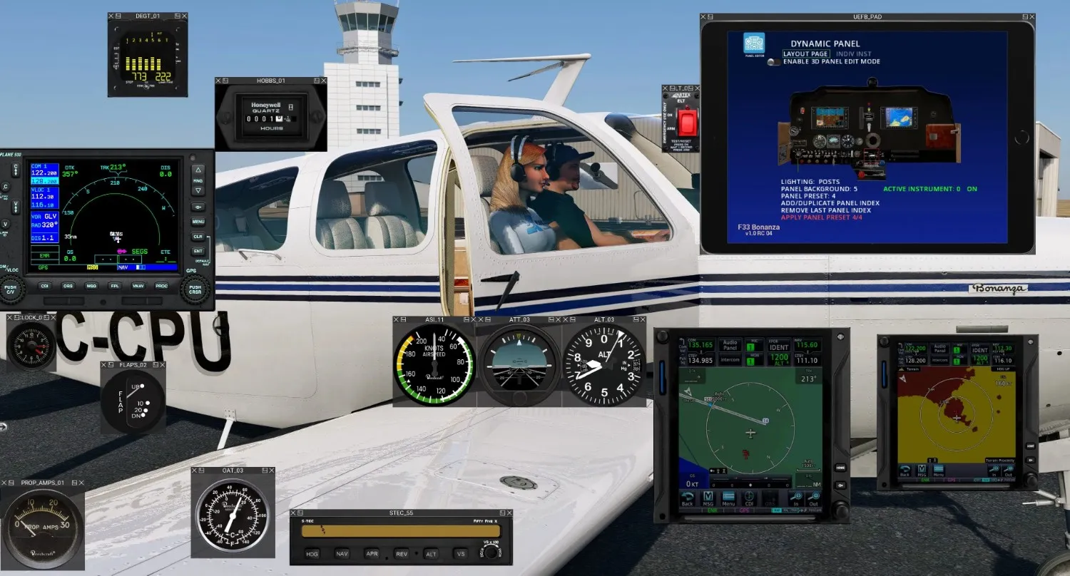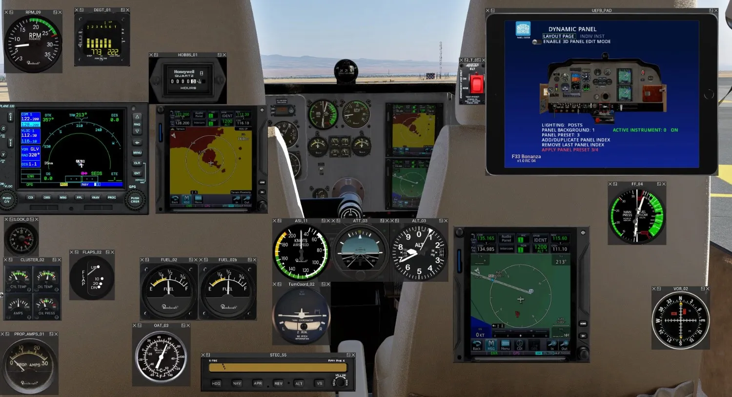 As with other aircraft in the Dynamic Generation Series, the Bonanza’s panel is not fixed in place. More than 60 instruments can be mixed and matched, moved between pilot and co-pilot positions, and saved as reusable presets. Support is included for RealityXP, as well as TDS GTN 650/750 units, GNS 430/530 swaps, and even G1000-style layouts, allowing the aircraft to be configured to suit various training needs, vintage tastes, or IFR touring preferences.
