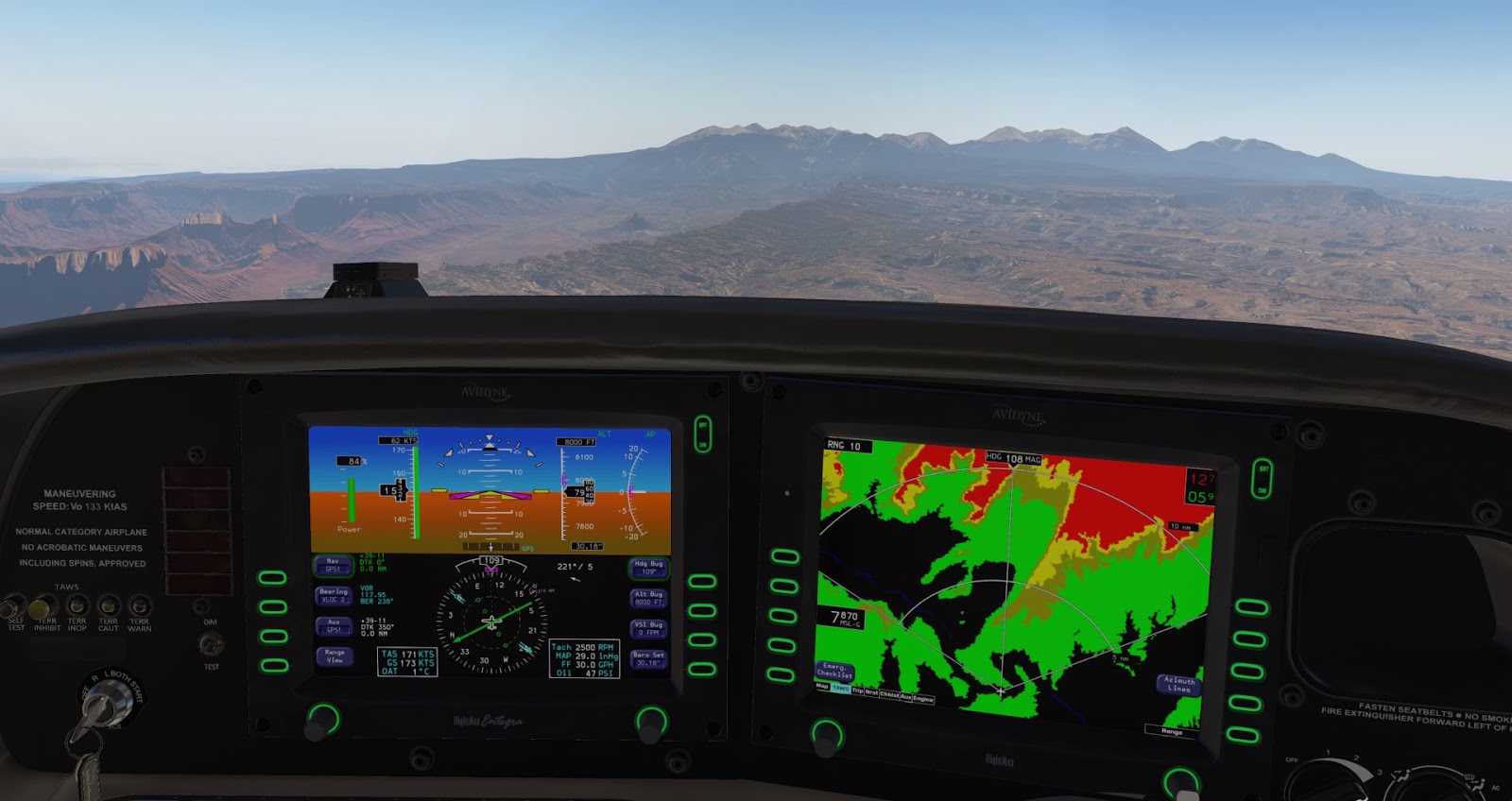 The Entegra avionics suite has been completely custom-coded by the TorqueSim developers. The avionics simulates numerous features such as a proper boot sequence, different modes, a "TAWS" system, checklists and much more. The full feature list is available on the TorqueSim Blog Post.