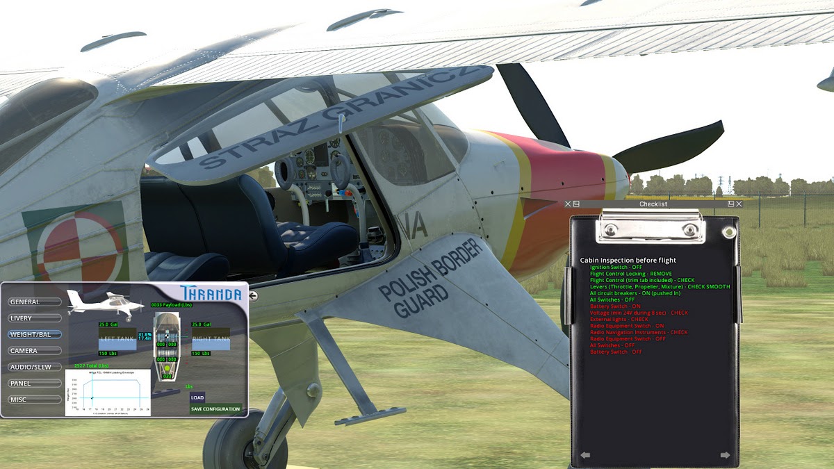- Detailed weight and balance manager with visual chart, individual passenger seat weight control, Lbs/KG unit toggle, CG control, and the option to save and load configuration.