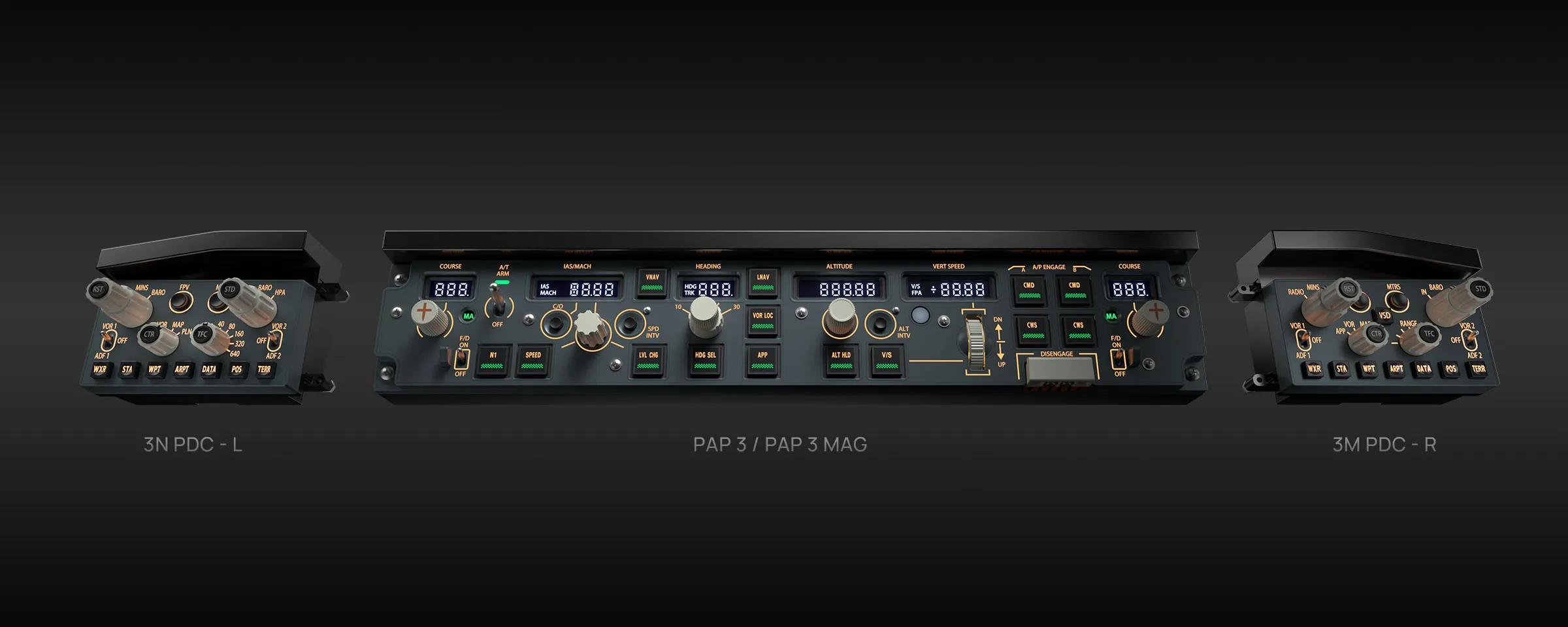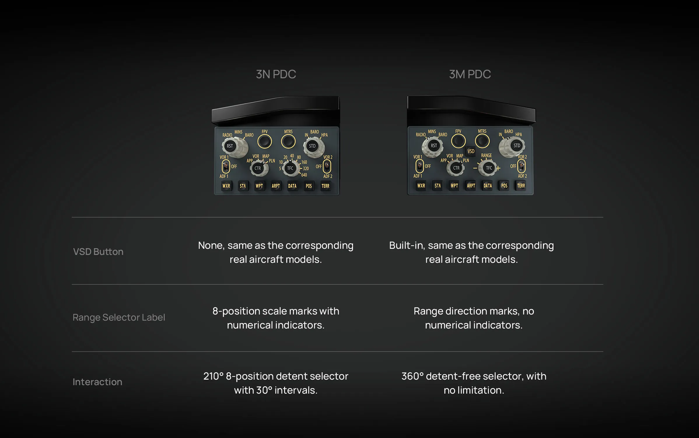 Meanwhile, the 3M PDC (737 MAX-style) features a dedicated VSD button, a detent-free 360° encoder, with simple minus/plus direction marks, and revised labelling, to match the IRL MAX.