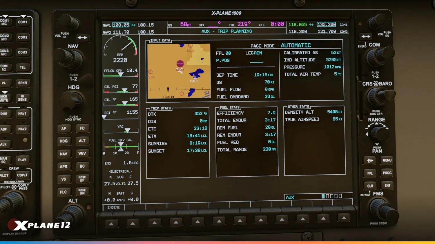 On the general aviation side, X-Plane’s default X430 and X530 now have working terrain, traffic, and weather pages, while the X1000 now features a dedicated page showing ETE/ETA.