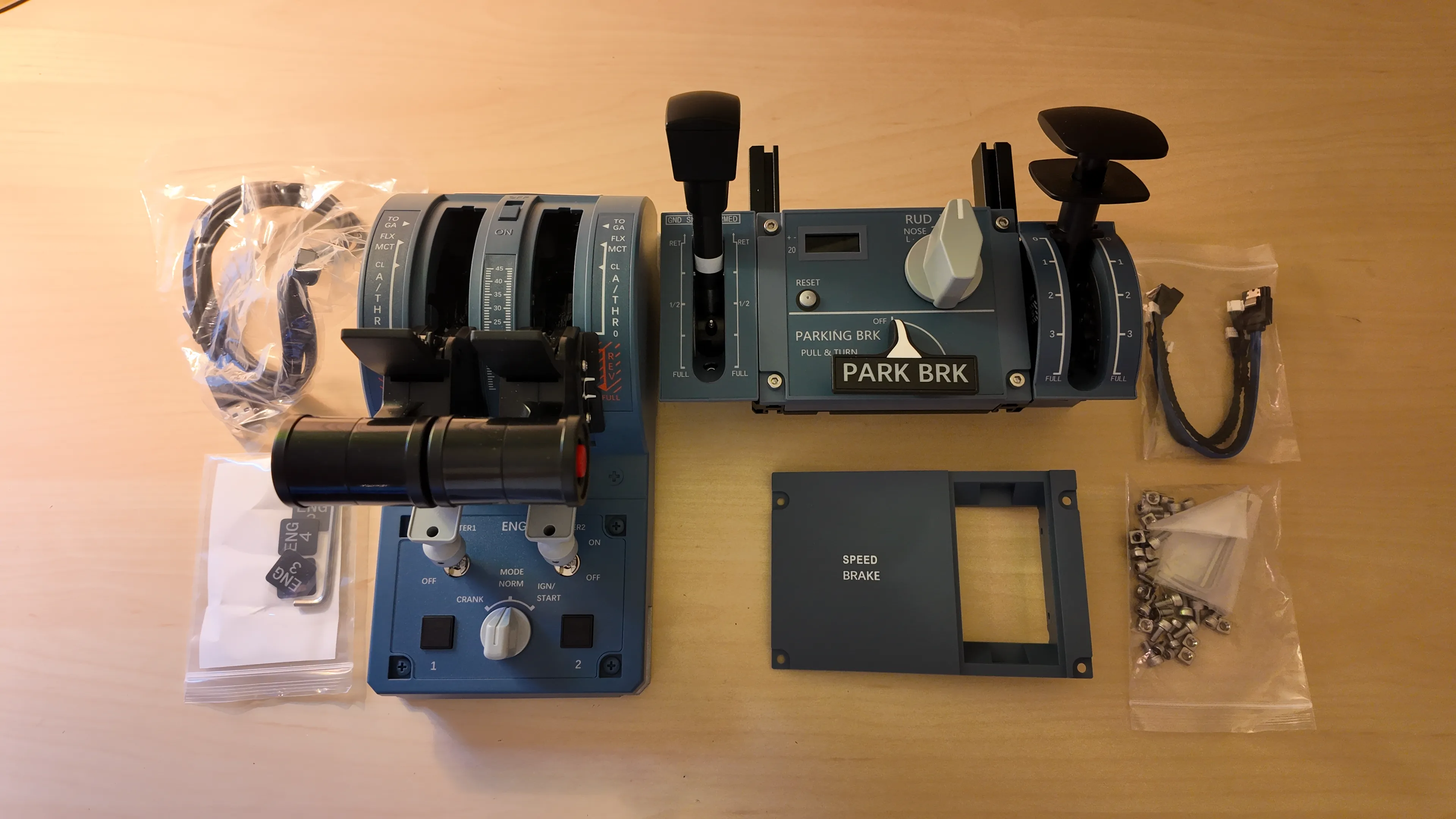In the PAC’s box, there is a short SATA-style data cable (plus an extra spare cable) to link the PAC to the throttle, a bag of screws, and another hex tool for mounting the two units together. You’ll also find a QA card, two metal detent plates (one each for the speed brake and flap mechanisms), and the PAC module itself. Everything is once again packed in cut-to-fit foam, so nothing shifted in transit.