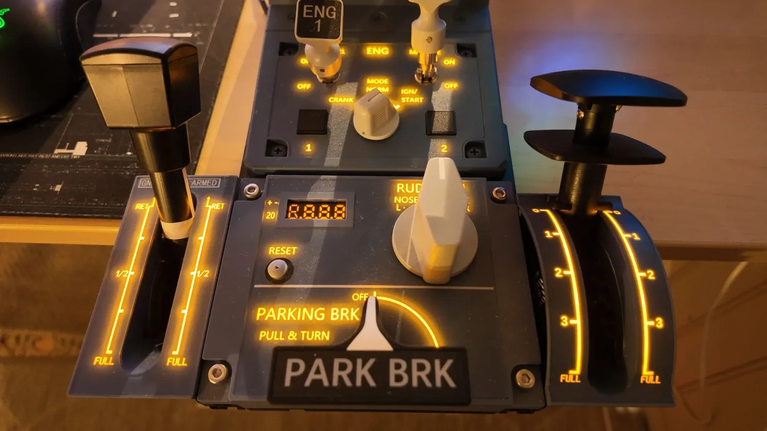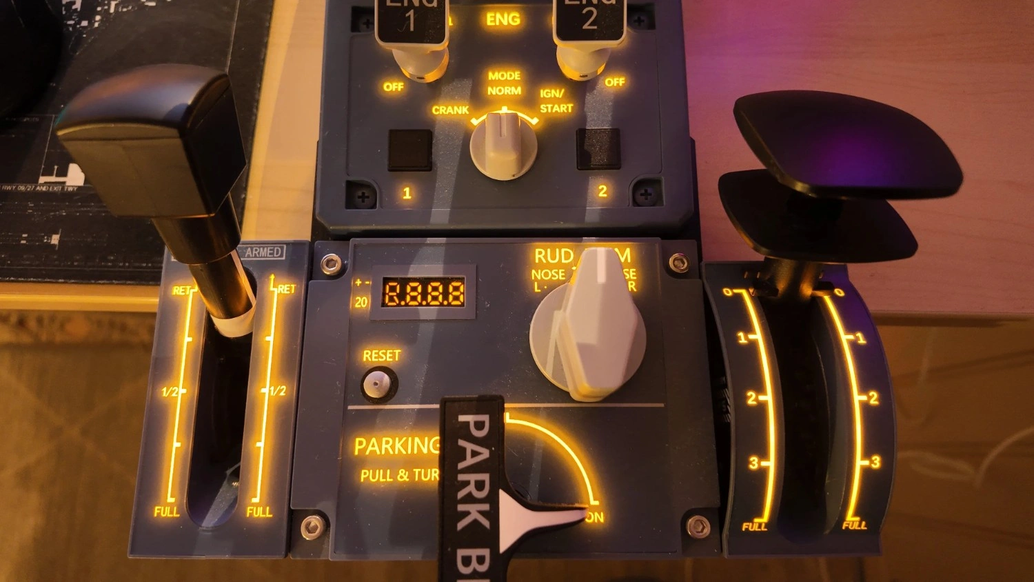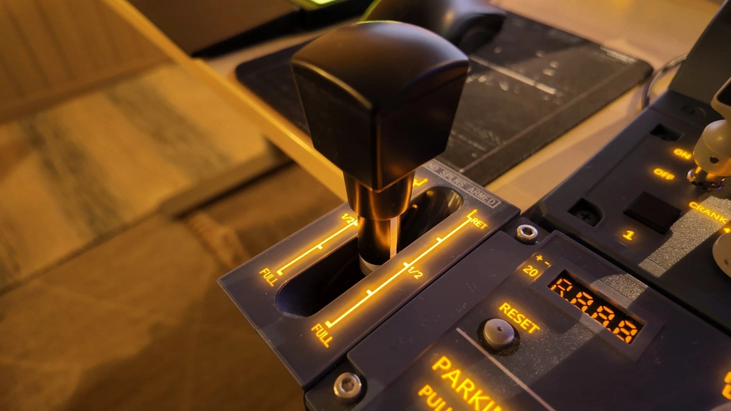 The speed brake lever again has the real Airbus functionality, where you must press down on the lever’s handle to move it out of the retracted (0/ARM) position.