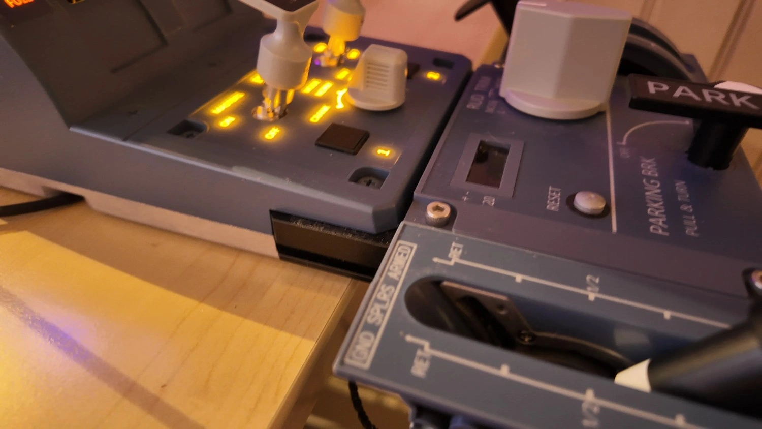 In other words, you cannot accidentally deploy spoilers without pushing down to unlock the lever, just like the lift-and-deploy action in the actual aircraft. It also has a tactile halfway detent to indicate the spoiler's half-extension position. This detent is easy to feel, so you can deploy to 50% without looking.