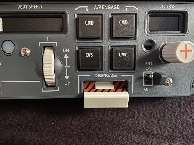 The panel shares the same height and width dimensions as the real life counterpart, and the attention to detail extends all the way to the small guards next to the two flight director switches. The same goes for the autopilot disengage bar. When it is pushed down to disengage the autopilot, a black and yellow striped background is displayed, to emphasize that the autopilot is no longer active.